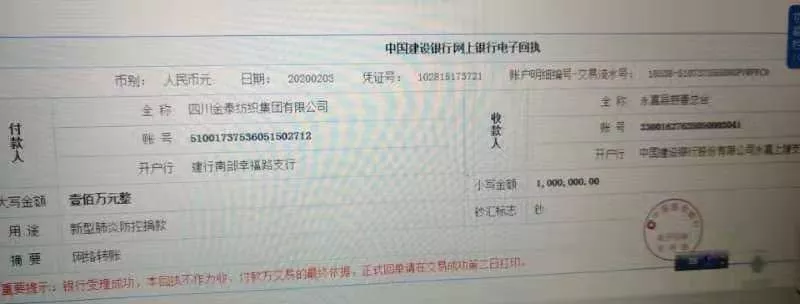 上午10時許,永嘉縣慈善總會收到了一筆特殊的網(wǎng)絡(luò)轉(zhuǎn)賬,記者在中國建設(shè)銀行網(wǎng)上銀行電子回折單上看到,付款人是四川金泰紡織集團有限公司,用途上寫著新型肺炎防控捐款,金額為一百萬元整。據(jù)永嘉縣慈善總會介紹,這筆捐款也是目前我縣收到的單筆最高捐款。